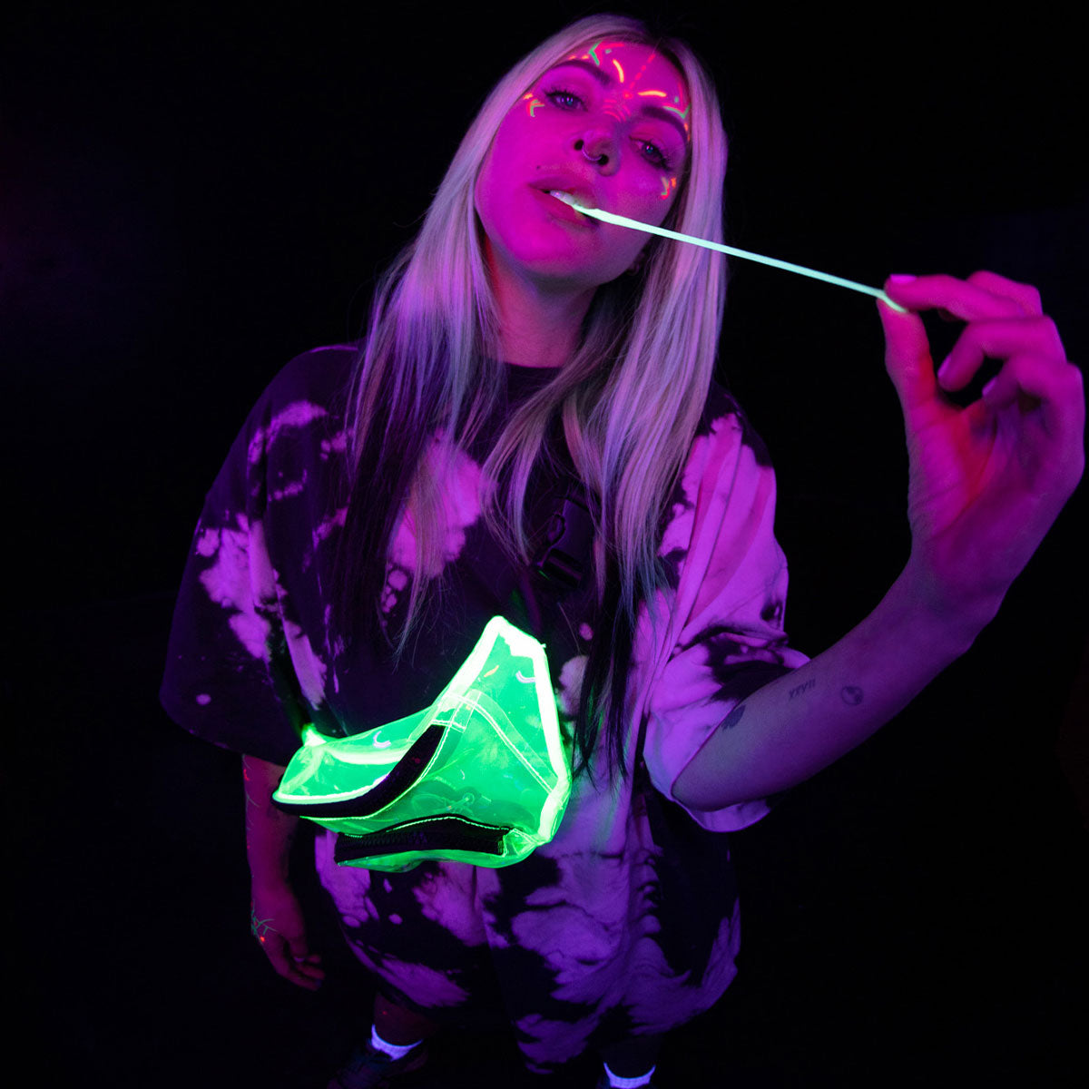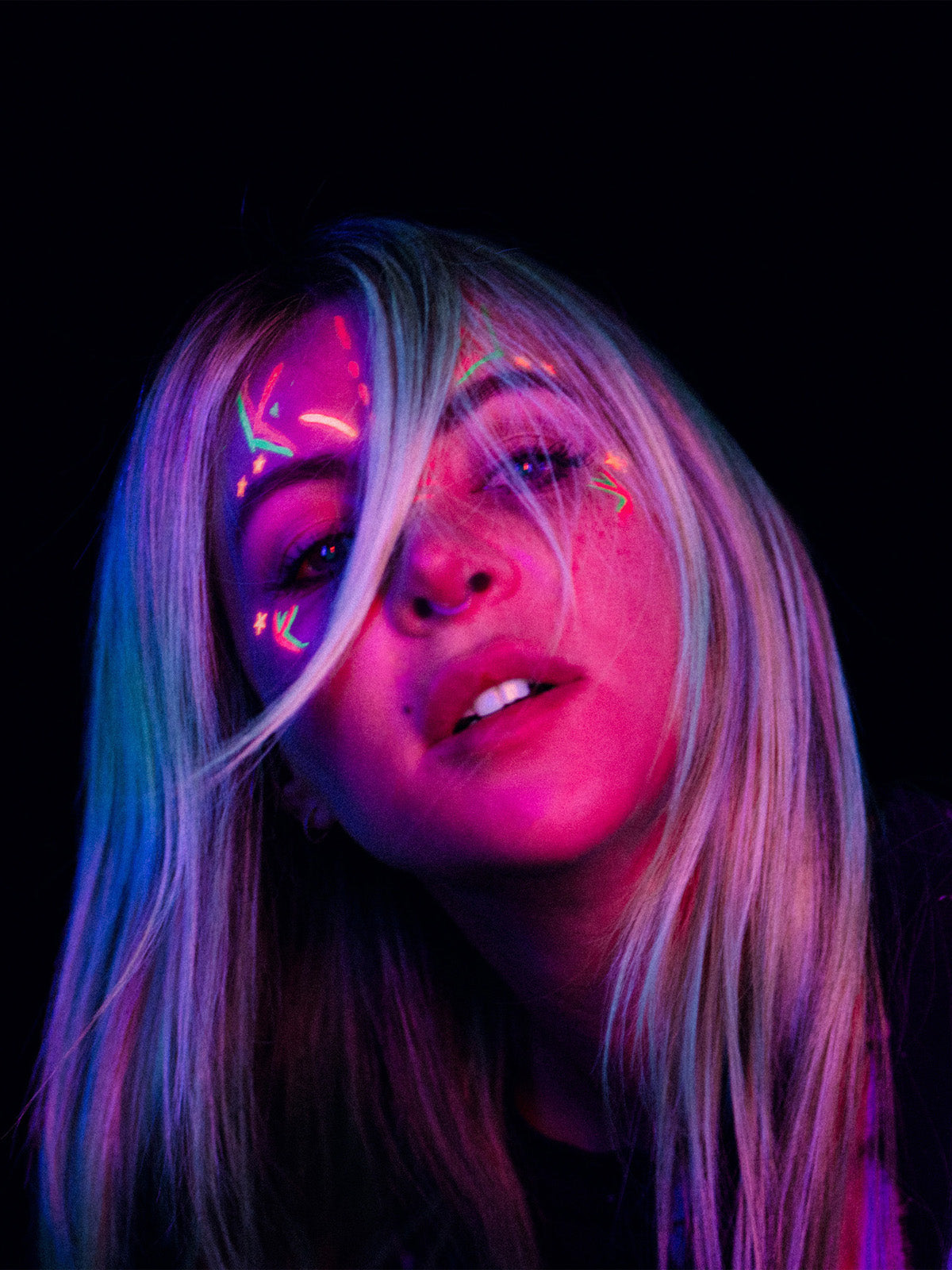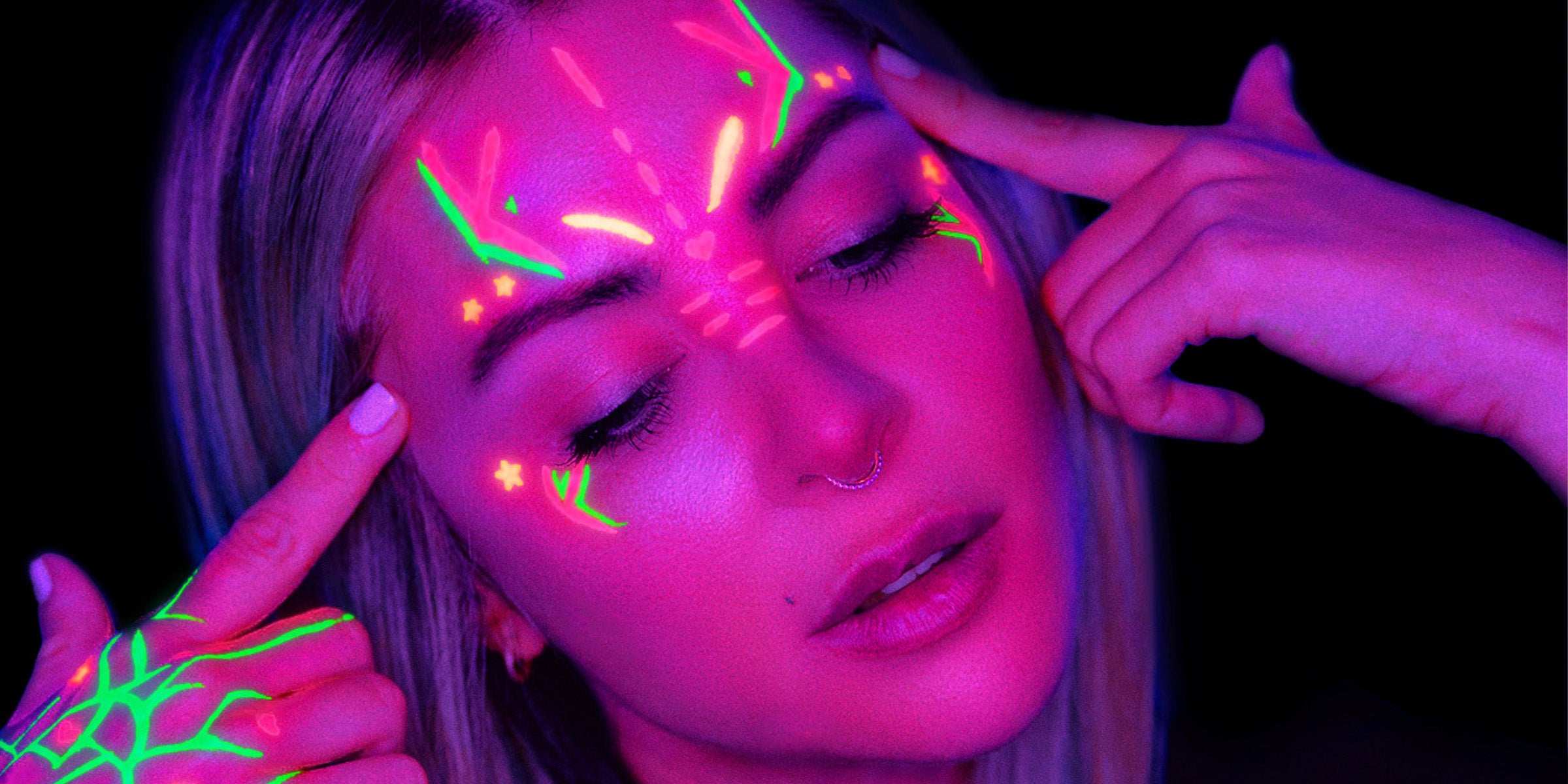 Move the slider to see UFO Body Art Stamp + Pen appear vivid in daylight and glow in blacklight.