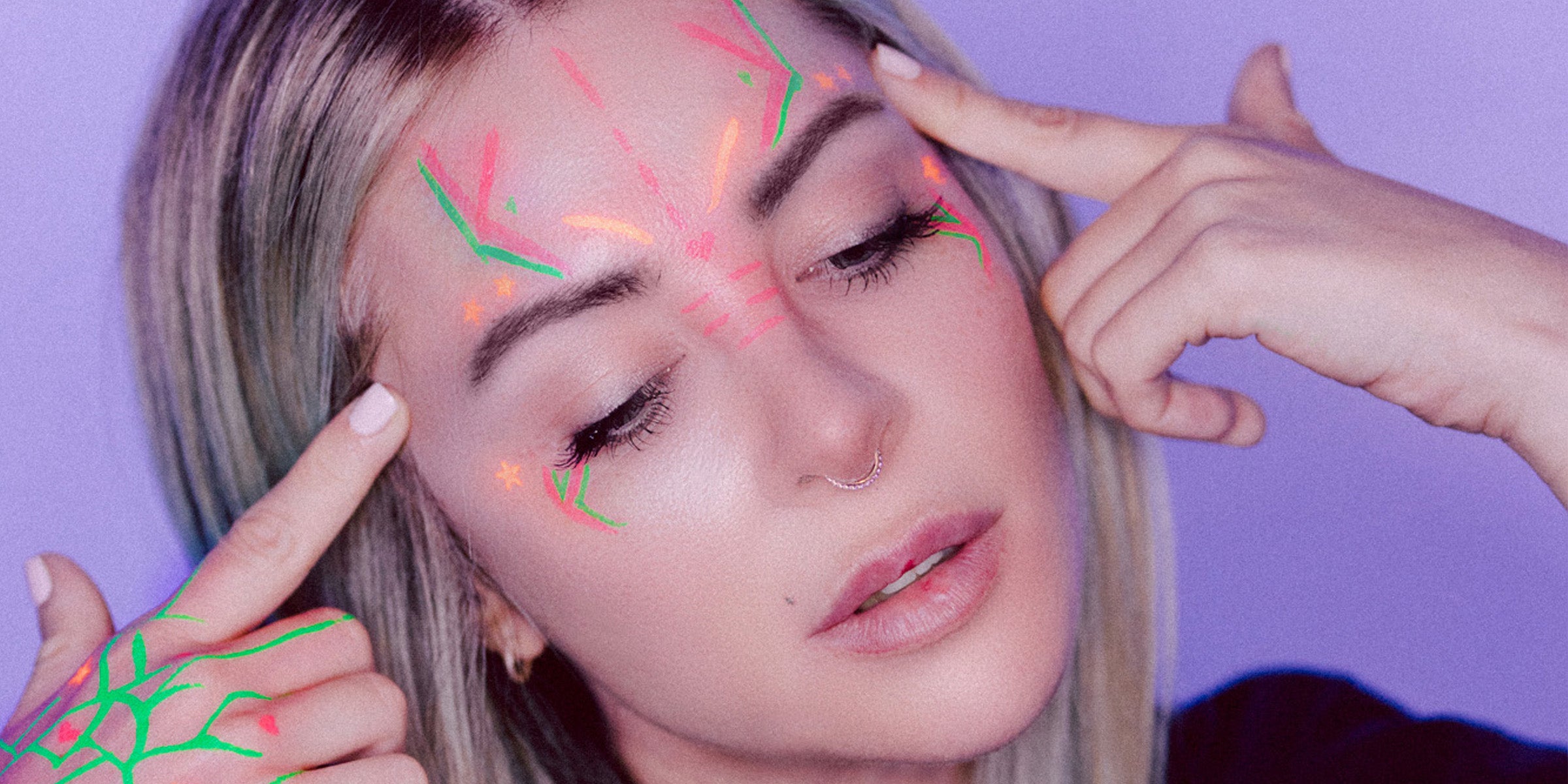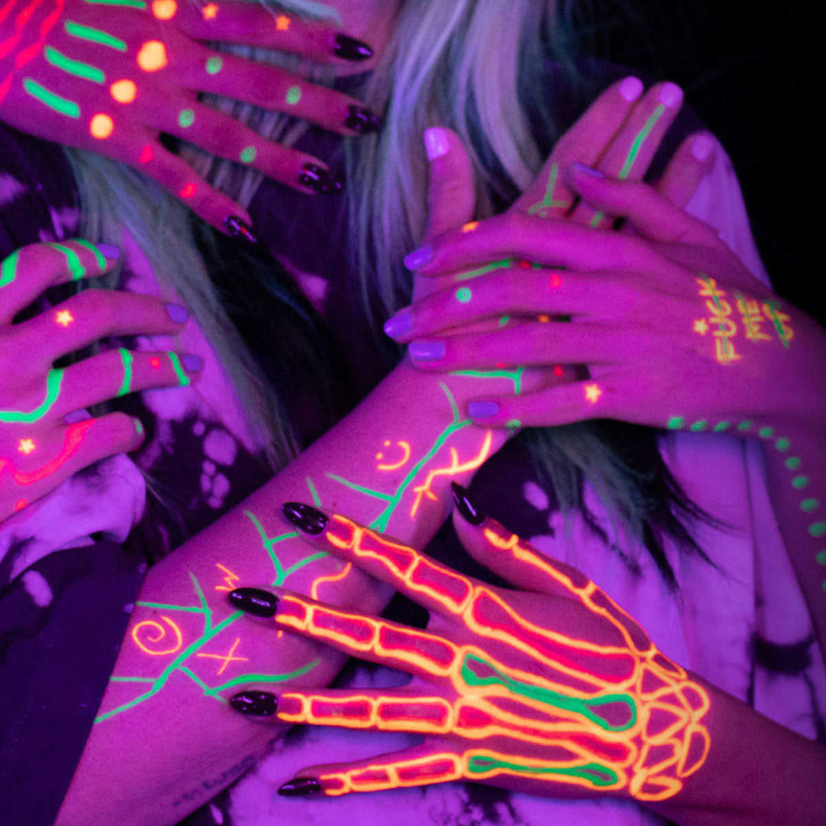 FMU Beauty’s UFO Body Art Stamp + Pens are designed to glow in blacklight at festivals, parties or simply expressing yourself and getting creative. Whether it’s a constellation of stars across your cheekbones, a dusting of hearts around your temples, or a line of smiley faces down each finger, there's an infinite amount of ways to get creative with body art using these stamps and liners.